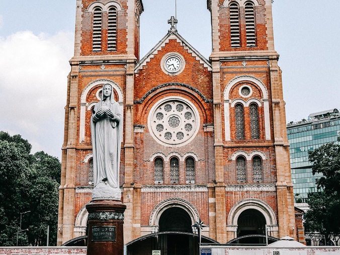 À proximité, arrêt devant l’un des sites les plus historiques de Saigon, la cathédrale Notre-Dame, édifice en briques rouges à deux flèches, inspiré de la construction originale de celle de Paris.